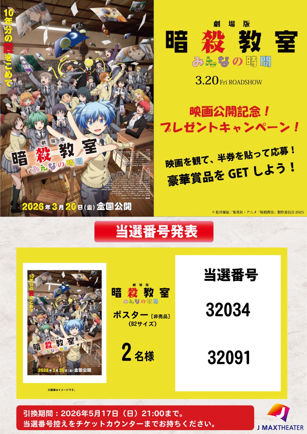 【上越】『劇場版「暗殺教室」みんなの時間』プレゼントキャンペーン 当選番号発表