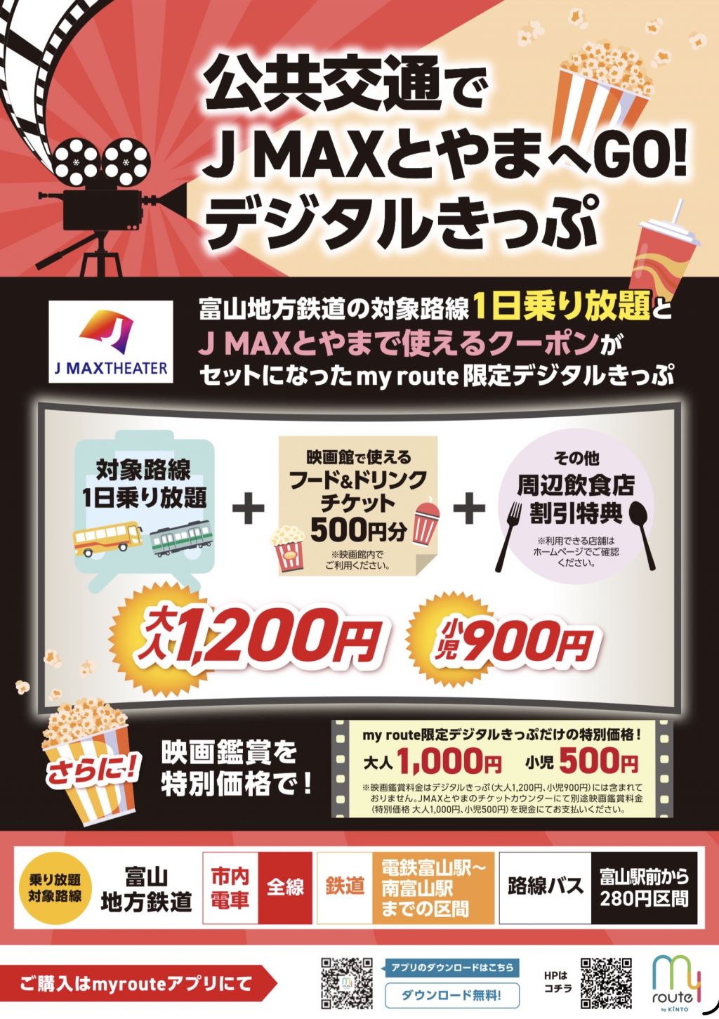 富山地方鉄道の対象路線1日乗り放題と J MAX THEATERとやまで使えるクーポンがセットになった my route 限定デジタルきっぷが発売中です!