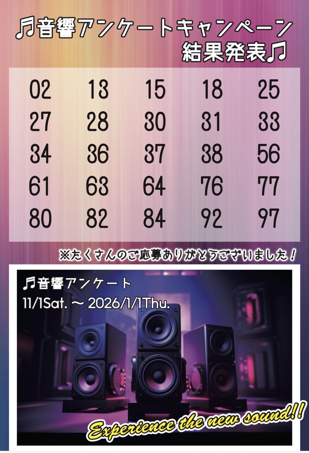 音響アンケートキャンペーンに、たくさんのご応募、誠にありがとうございました!